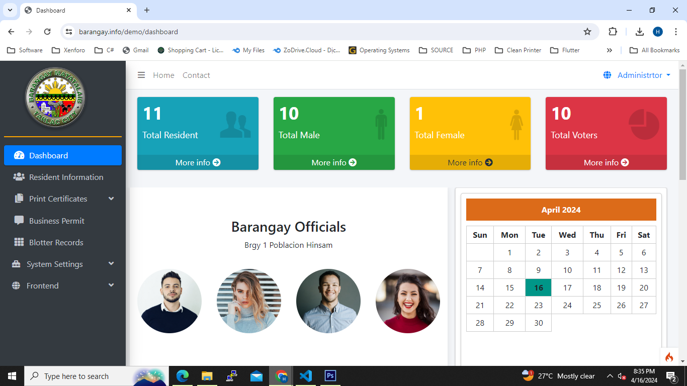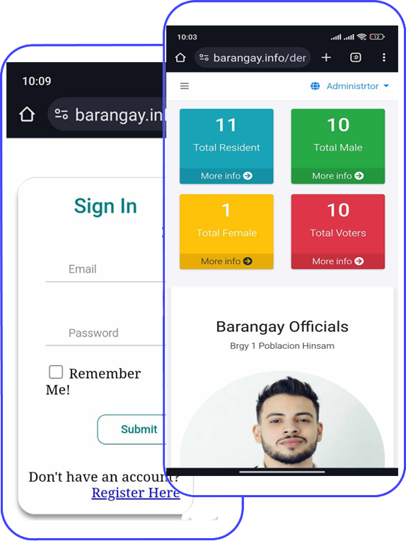 • on Our Barangay Management & Information System we are using PHP/MYSQL Codeigniter4 as a Framewrok and on our website we are using Bootstarp Themes..